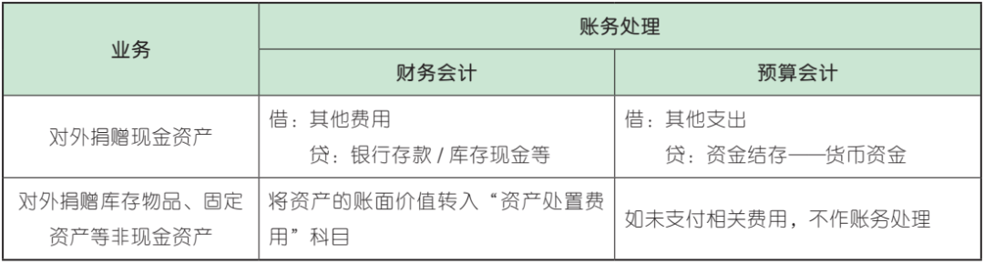 【解析】单位对外捐赠现金资产的,按照实际捐赠的金额,在财务会计中借记“其他费用”科目,贷记“银行存款”“库存现金”等科目。
